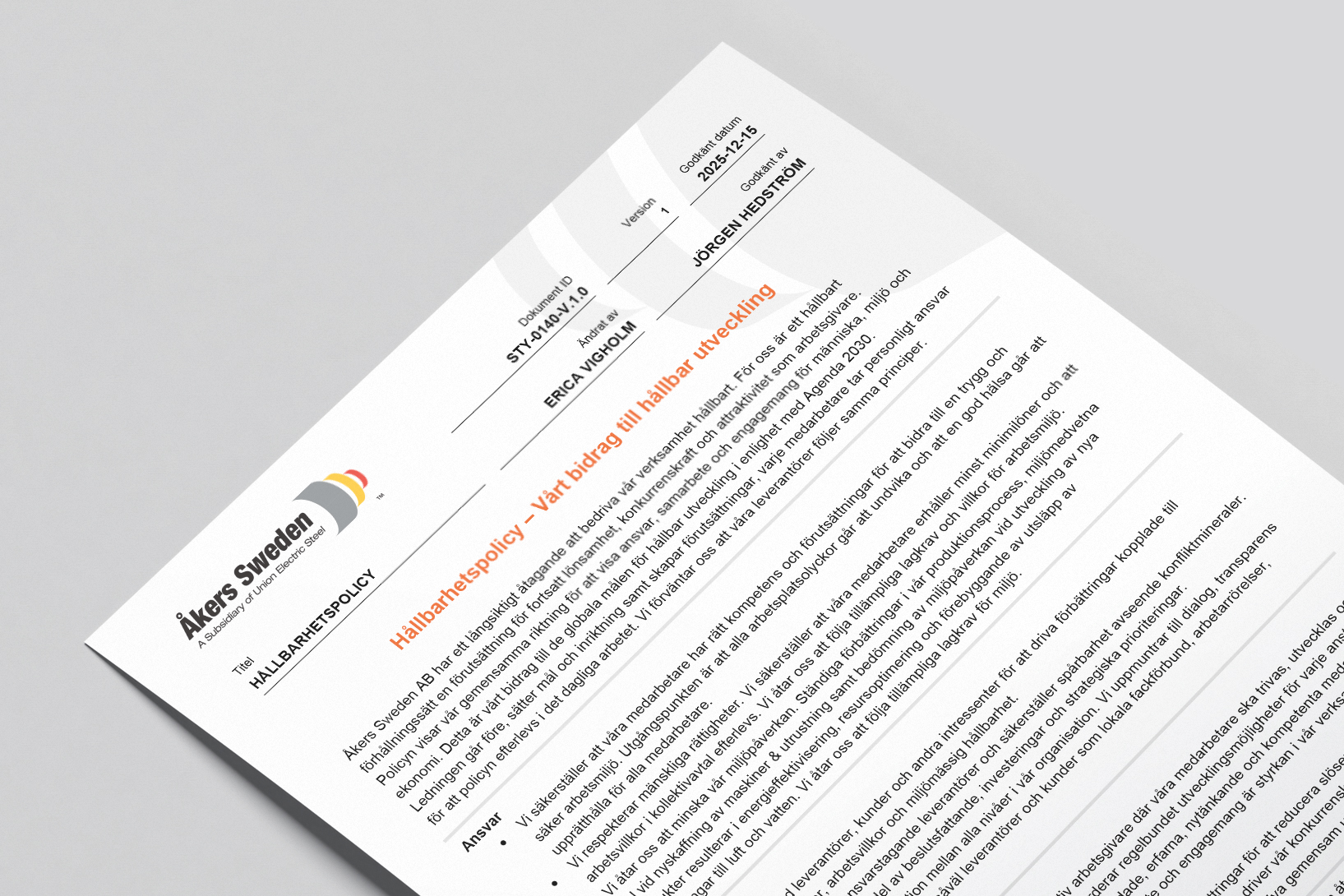 Åkers Sweden AB har ett långsiktigt åtagande att bedriva vår verksamhet hållbart. För oss är ett hållbart förhållningssätt en förutsättning för fortsatt lönsamhet, konkurrenskraft och attraktivitet som arbetsgivare.