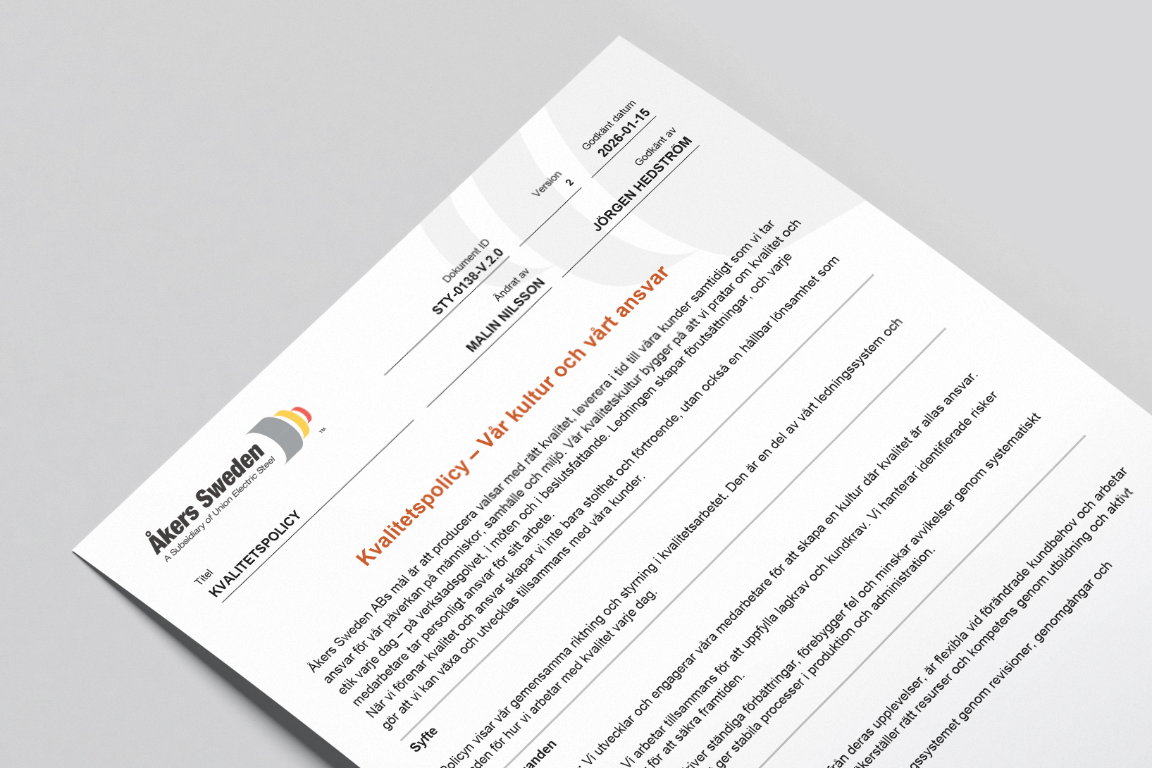 Åkers Sweden ABs mål är att producera valsar med rätt kvalitet, leverera i tid till våra kunder samtidigt som vi tar ansvar för vår påverkan på människor, samhälle och miljö.